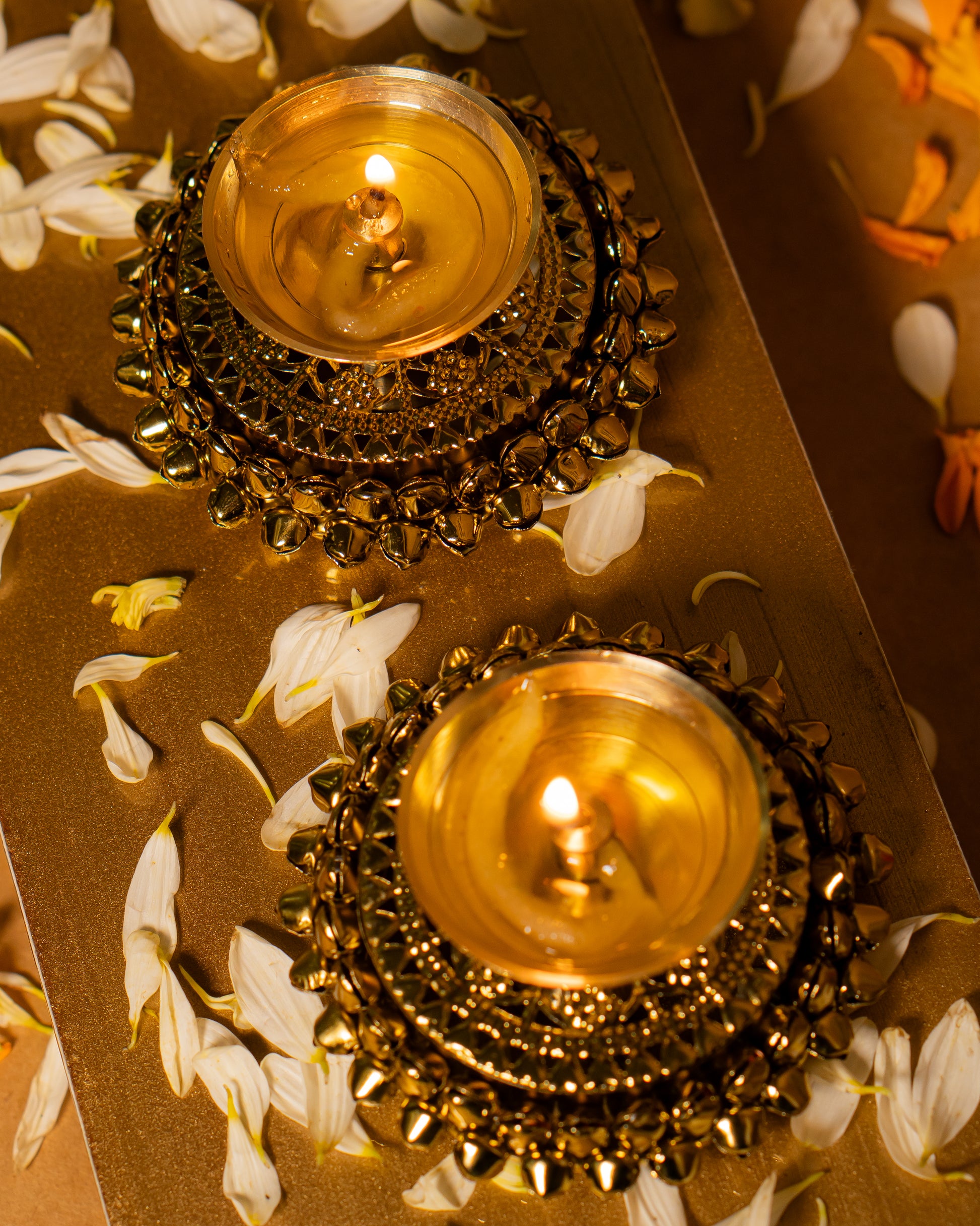 A stunning metal diya with intricate ghungroo embellishments, crafted to bring festive elegance and divine charm into any space. Each diya sits atop a beautifully carved metal base, adorned with tiny golden ghungroos that add a rhythmic, traditional touch. Designed to hold oil and a cotton wick, these diyas radiate a warm, soothing glow, symbolizing positivity, purity, and celebration. Comes in a set of 2 pcs, making it perfect for puja rituals, festive décor, or as a thoughtful gift.